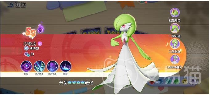 奇鲁莉安在等级达到48级且队伍中存在至少2名幻系宝可梦时,可完成第二次进化,成为沙奈朵。外观显著变化为裙甲结构强化、双臂能量环扩大。技能机制全面进化:“魔法闪耀”变为扇形AOE,覆盖角度达120度,基础伤害提升至280 0.9×特攻;被动“幻境增幅”新增效果:当沙奈朵存活时,全队成员普攻附带5%额外法术穿透。该形态兼具清线效率、定点压制与团队增益,是高端局中构建幻系阵容的核心枢纽。