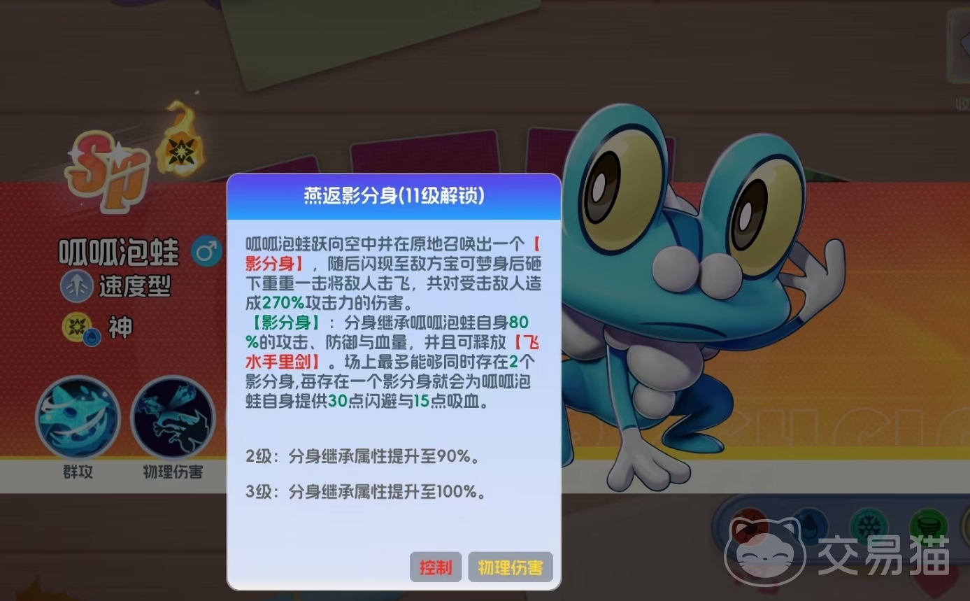其核心机制围绕“影分身协同作战”展开。等级达到11级后解锁技能【燕返影分身】,该技能不仅实现位移至敌方后排发动突袭,更会在原位置生成一个具备本体属性继承能力的实体分身。此分身可独立施放41级技能【飞水手里剑】,与本体同步输出;最多可同时存在两个分身。每存在一个分身,均会提升呱呱泡蛙自身闪避率与吸血效果;当本体受到伤害时,部分伤害将自动转移至分身上承担;若分身被击破,则呱呱泡蛙立即恢复一定生命值,并获得物理伤害加成。