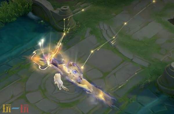 一技能:随手抛出璀璨星辰,在敌人身上凝成闪烁的浑天仪轨道;随着轨道中的星点逐一被点亮,积蓄的星能将轰然爆裂,随着狗子的跃起迸出绚烂星河。
