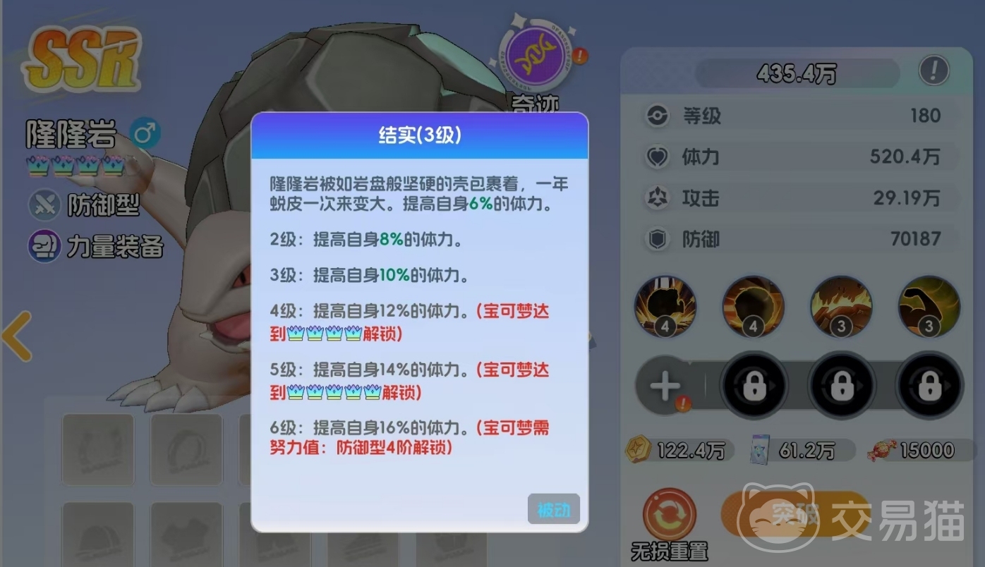 隆隆岩拥有两个关键被动:其一为“结实”,随等级提升逐步增加最大生命值,满级时最高提供22%基础生命加成;其二为“变圆”,生效后使每次所受伤害上限锁定为最大生命的7%,且当单次伤害超过最大生命5%时,自动触发防御强化效果,进一步巩固生存能力。两项被动协同作用,使其在持续作战中具备极强的容错率与抗压表现。