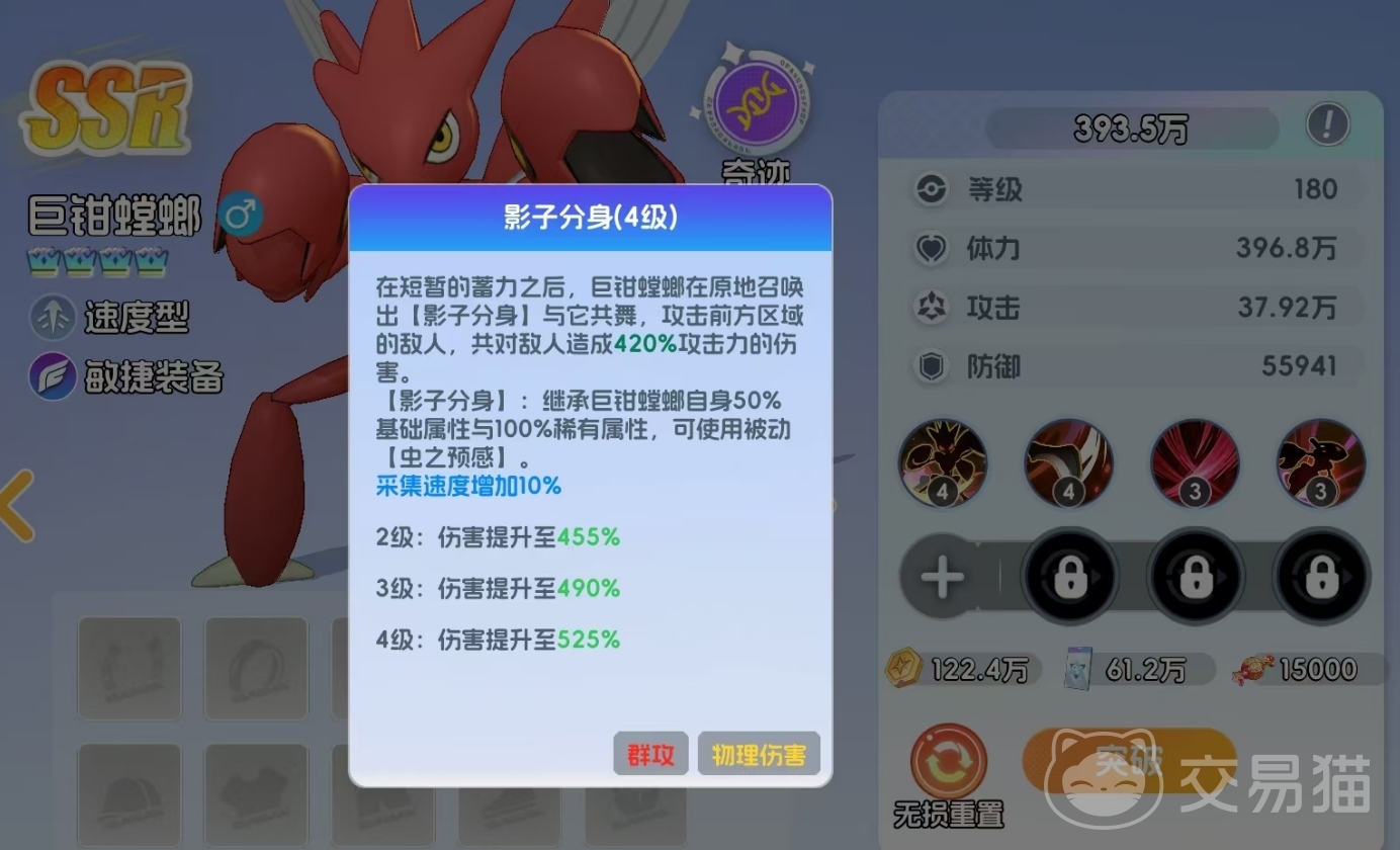 战斗表现方面,巨钳螳螂在怒气值满时会瞬发“影子分身”,该分身拥有本体50%的基础属性,并同步向前推进发动物理攻击,形成双线压制效果,大幅提升瞬间输出效率。当等级提升至61级后,影子分身还可协同触发被动技“充之预感”,额外获得攻击力加成;同时,在自身血量低于50%时,自动激活1秒无敌状态,生存韧性显著增强。此外,其突击能力随等级逐步解锁:11级开放后排突袭技能,可无视前排直接切入敌方后排造成伤害;41级习得连斩后,还将永久提升闪避率,大幅降低被命中概率,实现高机动性下的稳定输出。