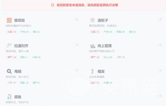 游戏核心玩法围绕动态决策展开。每个关键节点均设置多维度选项,其影响覆盖短期资源变动、中期团队信任度及长期职业天花板。例如某次需求评审中的技术方案取舍,可能直接触发后续迭代延期、客户投诉或架构重构事件,进而改变季度绩效评级与跳槽机会窗口。