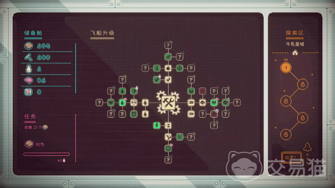 资源获取方式直观高效:击毁目标后掉落咖啡豆,进入飞船吸附范围即自动收集;界面底部设有实时采集进度条,满额后可触发区域通关条件,击败守关Boss即可解锁下一张探索地图。