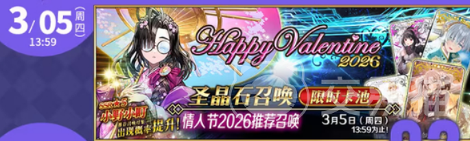角色获取方面,情人节版本更新后将实装新从者小野小町;同期开放常驻五星女性从者及剧情限定五星女性从者双周替卡池(具体名单以正式公告为准)。新春活动期间,国服独家推出“第二部通关应援福袋(第三期)”,该机制参考美服2025年11月感恩节活动设计,目前日服尚未实装同类内容。