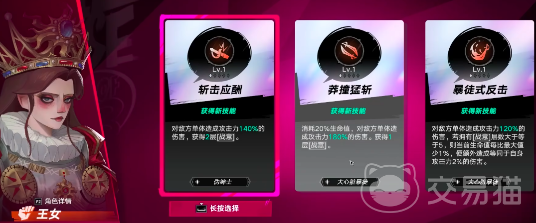 王女作为近战主攻手,技能组合强调机动性与反制收益。可选技能包括战击应酬、莽撞猛斩及暴徒式反击。主武器配备单手剑,兼顾突进速度与攻击频率。其中暴徒式反击基础伤害为120%攻击力,当战意层数超过5层时,每层额外提供2%伤害加成,形成越战越强的滚雪球效应。