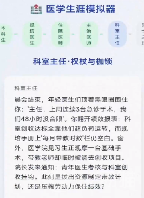 《医学生涯模拟器》是一款深度还原医学教育与职业成长路径的沉浸式模拟游戏。玩家将从医学院新生起步,经历理论学习、临床实习、执业考试、职称晋升等完整阶段,在高度拟真的手术室、病房、实验室等场景中锤炼专业能力。游戏不仅注重知识体系构建,更强调医患沟通、伦理判断与多线程决策——每一次诊断方案、专科方向或职业选择,都将切实影响角色的成长轨迹、人际关系网络及最终成就结局。