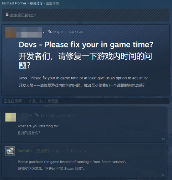Zantai简短地回复道:“请先购买游戏,而不是运行所谓的‘非Steam版本’。”随后该帖子立刻被锁定。