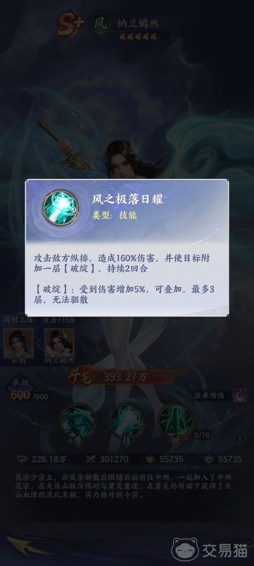纳兰嫣然为S 阶斗者,核心价值在于团队增伤与状态压制的双重能力。她的普攻可对单体目标造成伤害并施加“破绽”效果;而大招“风之极·落日耀”则能精准打击敌方前排单位,造成高额爆发伤害的同时,额外叠加一层“破绽”。该状态可持续两回合,是触发后续连锁伤害的关键前置条件。