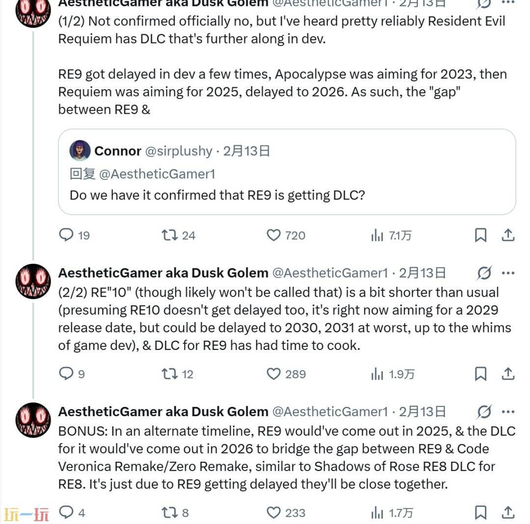 知名爆料人Dusk Golem最新消息显示,《生化危机9》DLC开发进展顺利,预计2026年内推出。同时卡普空已着手规划《生化危机10》,暂定2029年发售,或将开启全新故事篇章。这一紧凑的开发周期打破了系列传统4-5年的代际间隔。