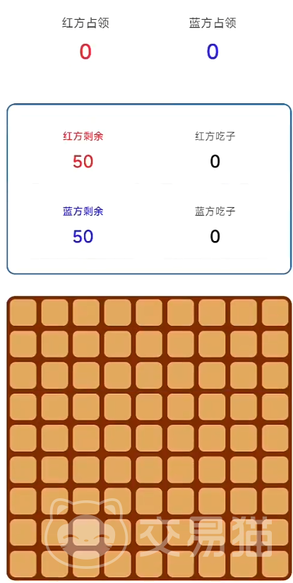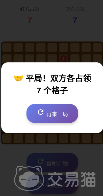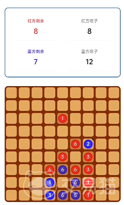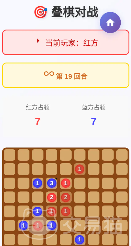游戏采用标准方形棋盘,红蓝双方交替行动。每回合可在空格落子,或在已有棋子的格子上叠加,单格最高支持6层堆叠。胜负判定以终局时双方各自控制的格子数量为准;若数量相等,则判为平局。基础机制简洁直观,儿童与**均能快速理解并投入对局。