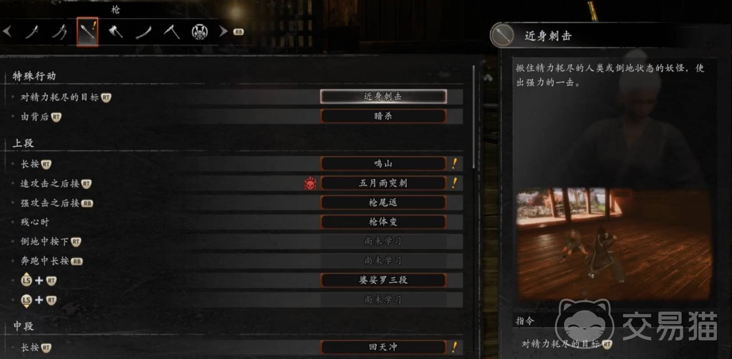 技能组合需紧扣武器本体设计语言。以长枪为例,其核心优势在于中距离压制与破势能力。推荐优先装配「近身刺击」与「枪尾返」两式:前者可在敌人精力枯竭或倒地时触发高倍率处决伤害;后者则通过枪柄末端快速击打,强制中断敌方动作并制造硬直窗口。二者衔接使用,可形成“压制—破势—追击”的稳定输出循环,显著提升控场效率。