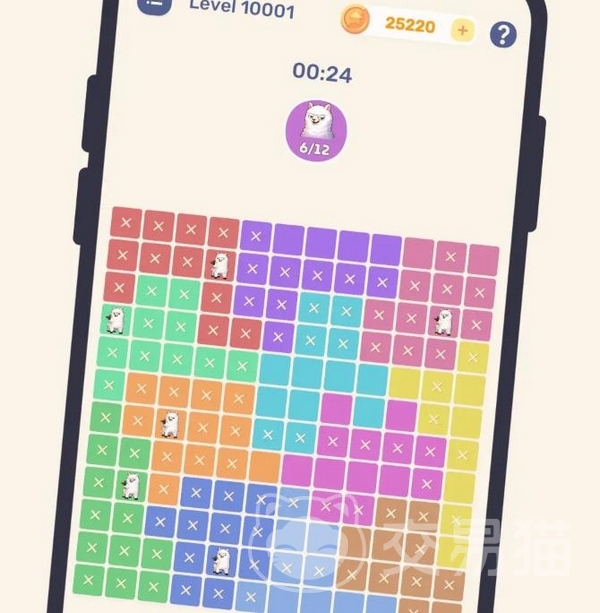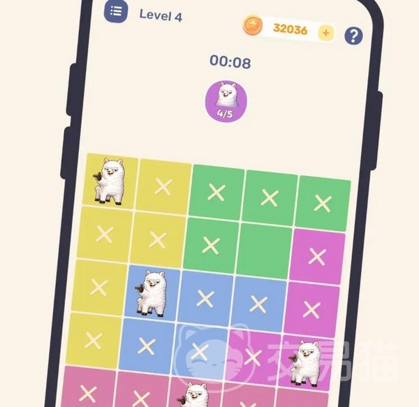 游戏整体采用极简视觉风格,摒弃繁复数值成长线与战斗系统,聚焦于纯粹的逻辑约束解题体验。棋盘由多色区块构成,每关需依据三重限制条件完成布局:同一行、同一列、同一颜色区域内均仅允许存在一只羊驼;且所有羊驼之间不可相邻——包括上下、左右及四个对角方向。