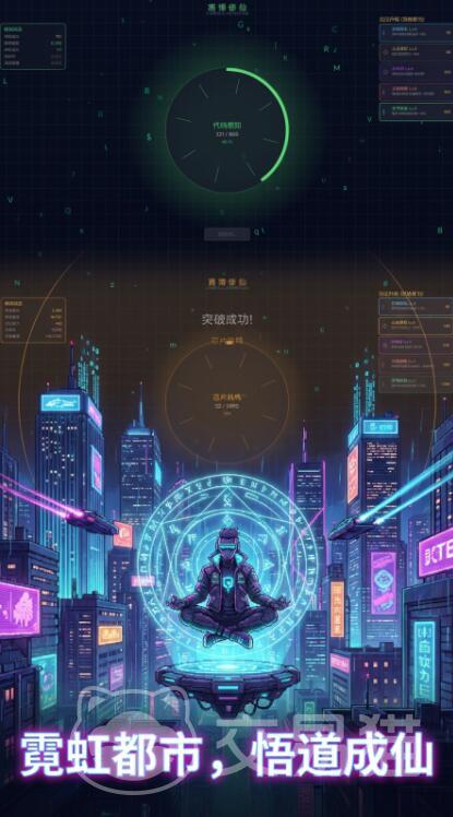 《赛博修仙:霓虹觉醒》是一款融合赛博朋克美学与东方修仙体系的创新型放置类手游。它跳脱出传统修仙题材的叙事框架,以“数据灵根”“量子能量”“共鸣芯”等原创设定重构修仙逻辑,打造兼具科技感与修真哲思的沉浸式体验。
