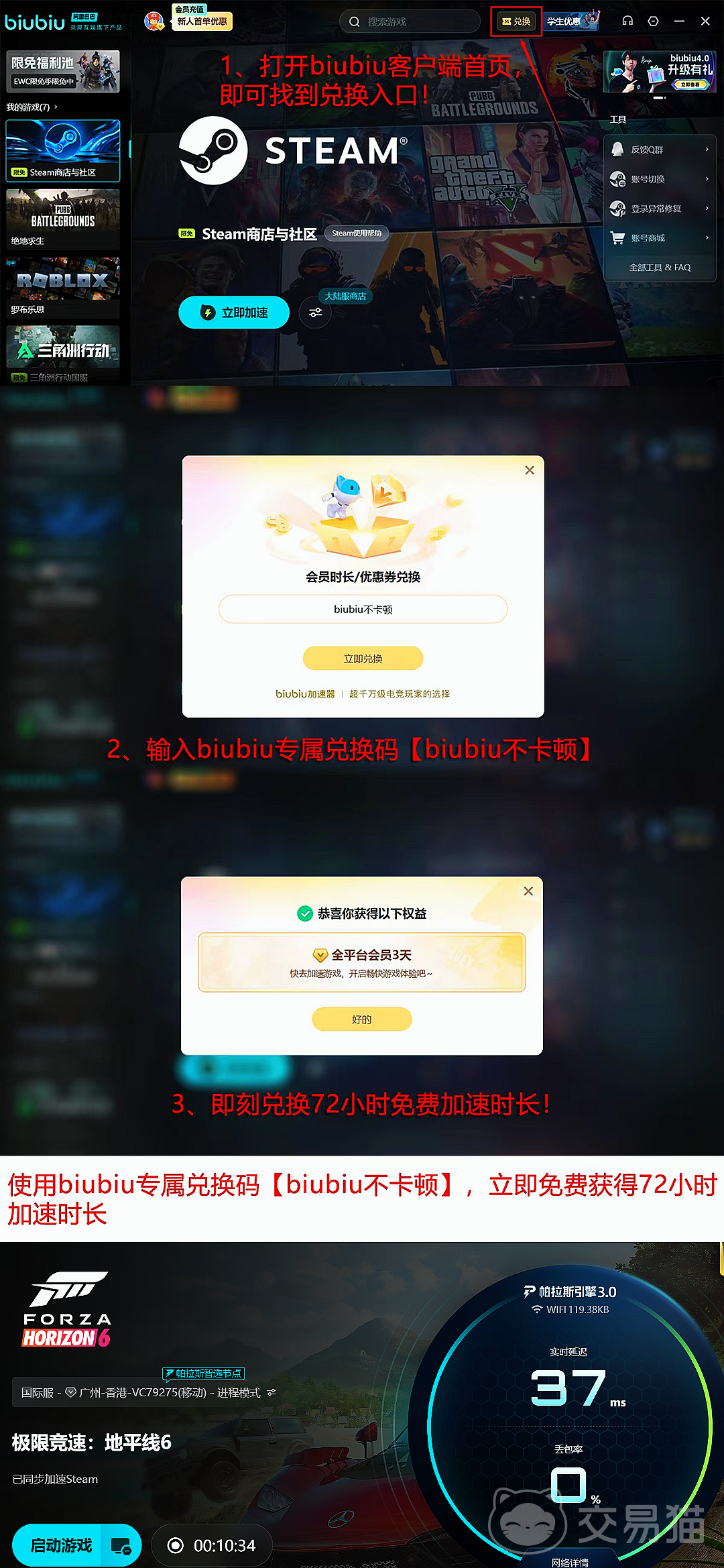 当前加速服务面向新用户提供24小时全游戏免费试用权限;所有用户凭兑换码【biubiu不卡顿】可额外领取3天无限制加速时长,零门槛体验稳定低延迟环境。