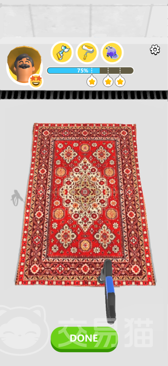 游戏采用分关卡推进机制,每关呈现一张具有独特纹理或几何构图的脏污地毯。任务目标并非统一要求“全面清洁”,而是依据当关指令动态设定——例如某关仅需清除所有可见垃圾颗粒,此时可跳过吸尘器操作,直接使用手指点击拾取并丢弃杂物;若时间充裕,再启用吸尘器进行二次处理,有助于提升最终评分与得分表现。