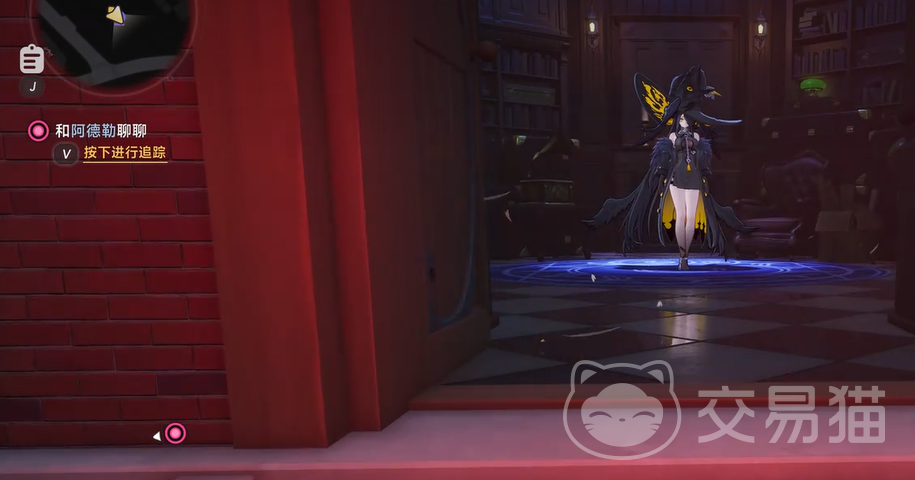 目的地为一栋外观鲜明的红色独栋房屋,建筑风格融合哥特元素与童话意象,视觉特征突出。靠近正门后,按互动键轻敲门扉,随即触发专属过场动画:画面首帧呈现一顶悬浮的黑色宽檐帽,随后身着暗色长袍、佩戴银饰的魔女黑羽现身,正式开启场景交互流程。