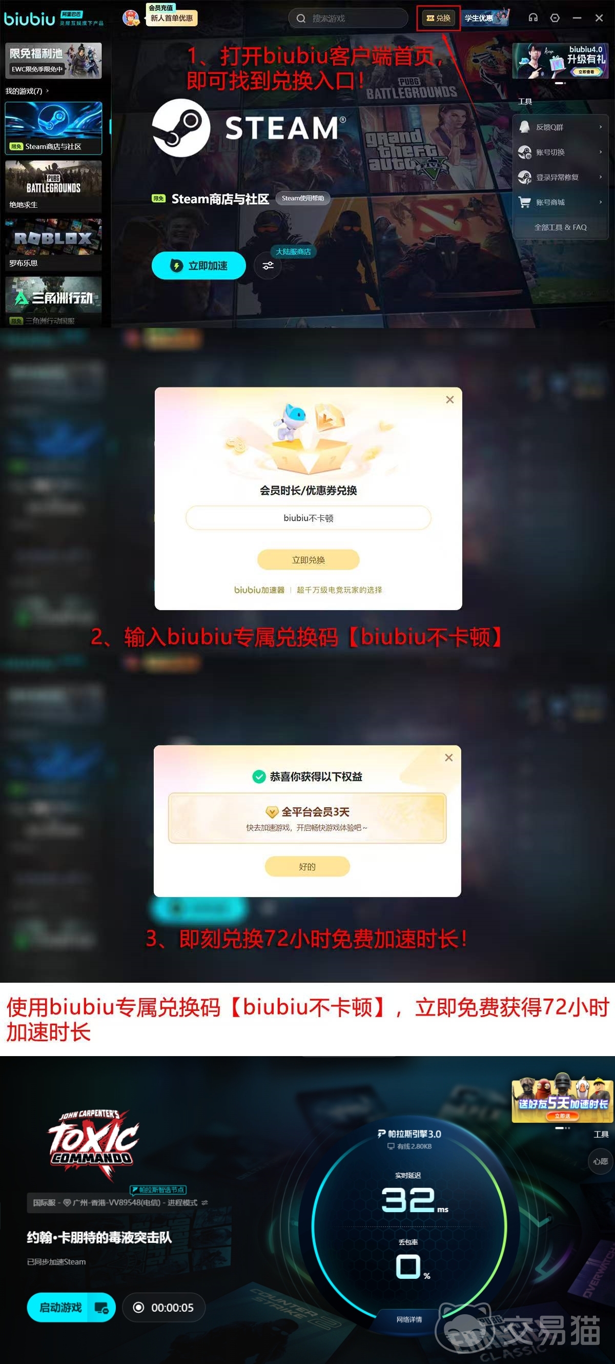 新用户注册即可免费获得24小时全功能使用权;另提供【biubiu不卡顿】专属兑换码,激活后可额外延长3天连续使用时长。所有加速服务均基于独立节点调度系统,无需修改系统设置或安装额外驱动。