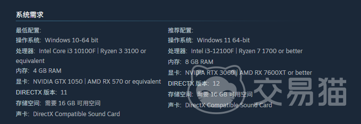 根据已公开的技术参数,本作对设备性能要求处于中等水平。若希望实现稳定流畅体验,建议最低配置为:CPU需达到Intel Core i3-12100F或同级产品;系统内存不低于8GB;显卡需配备NVIDIA GeForce RTX 3060及以上型号;安装所需存储空间约为16GB。