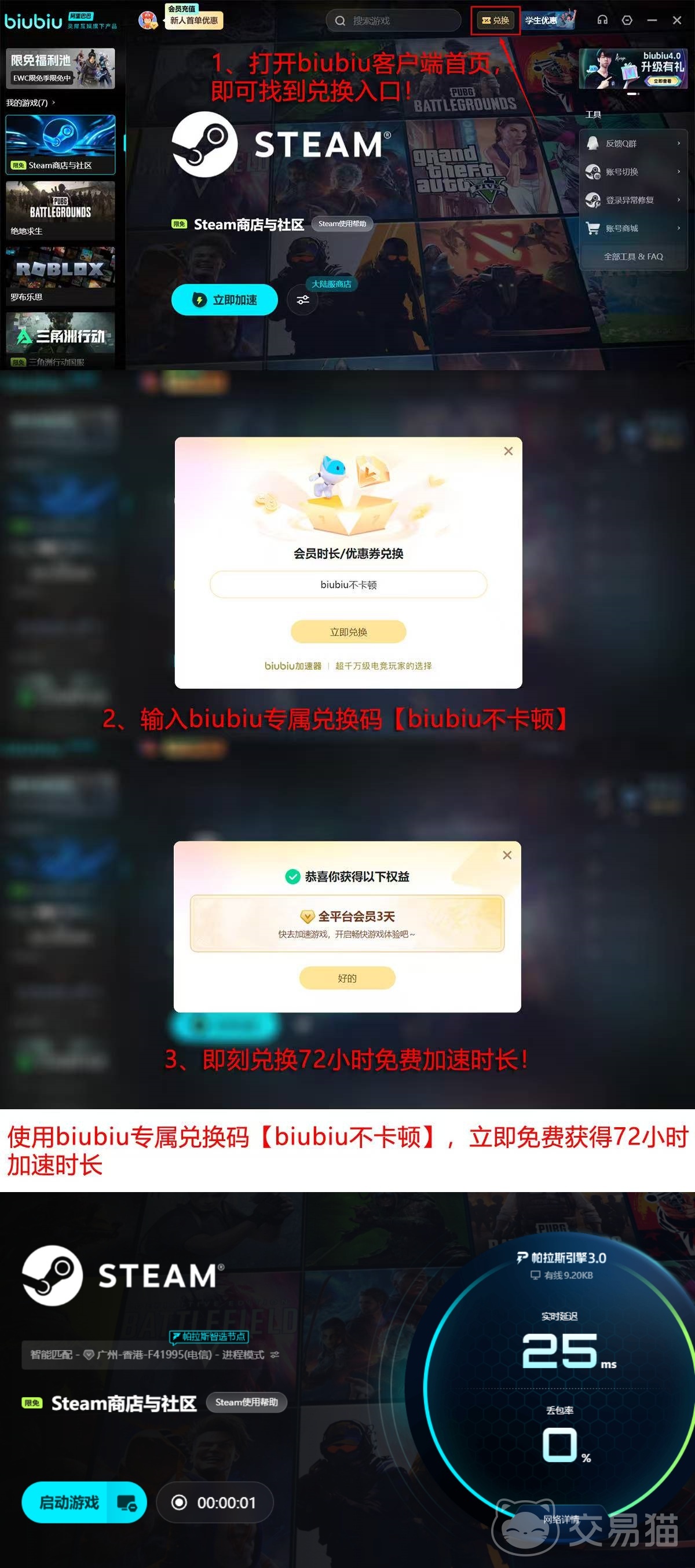 新用户首次启动biubiu加速器即可获得24小时免费加速时长。若需延长使用周期,可在激活界面输入兑换码【biubiu不卡顿】,额外领取3天免费加速权益。