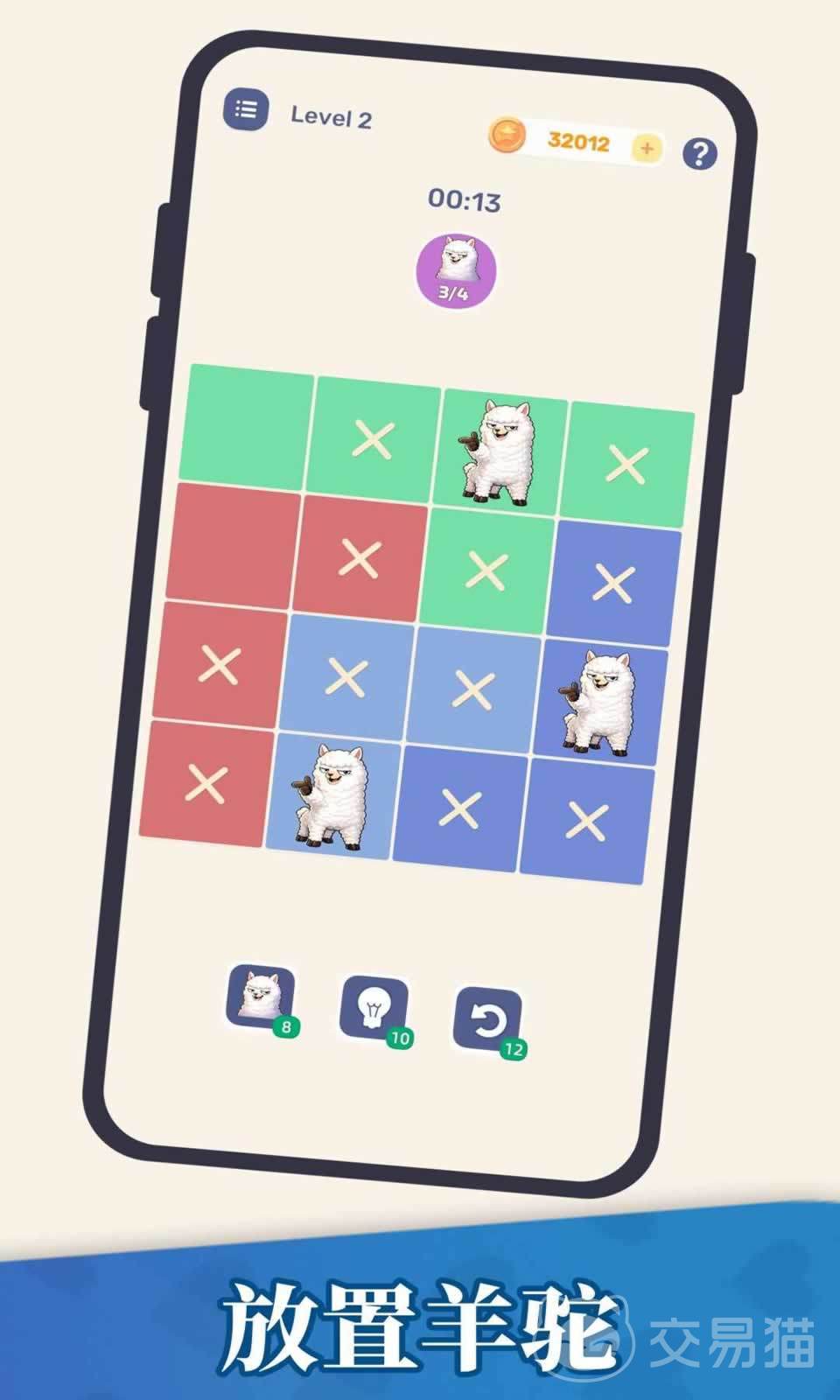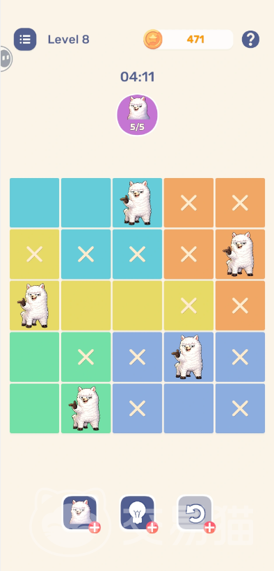 游戏采用极简主义美术语言,以色彩分明的方格矩阵构建主界面,整体呈现轻盈明快的视觉节奏。玩家需依据关卡设定,在限定区域内精准部署指定数量的羊驼角色,达成唯一合法布局。该机制虽借鉴经典逻辑范式,但在规则维度上实现多重创新:每种颜色区域仅允许出现一只羊驼;任意相邻格(含上下左右及对角线)不得存在其他羊驼;同时,每一行、每一列亦严格限定为单只羊驼。由此形成的约束体系,使上百个关卡各具思维张力,既考验基础推理能力,也鼓励策略性试错。