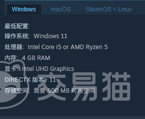 游戏运行基础要求较低:最低配置仅需搭载核显的Intel Core i5处理器、4GB内存及500MB可用存储空间;推荐配置则为Intel Core i7级别CPU、NVIDIA GeForce GTX 1060独立显卡、8GB内存,存储需求仍为500MB。当前主流PC设备普遍满足该标准,绝大多数用户无需升级硬件即可运行。