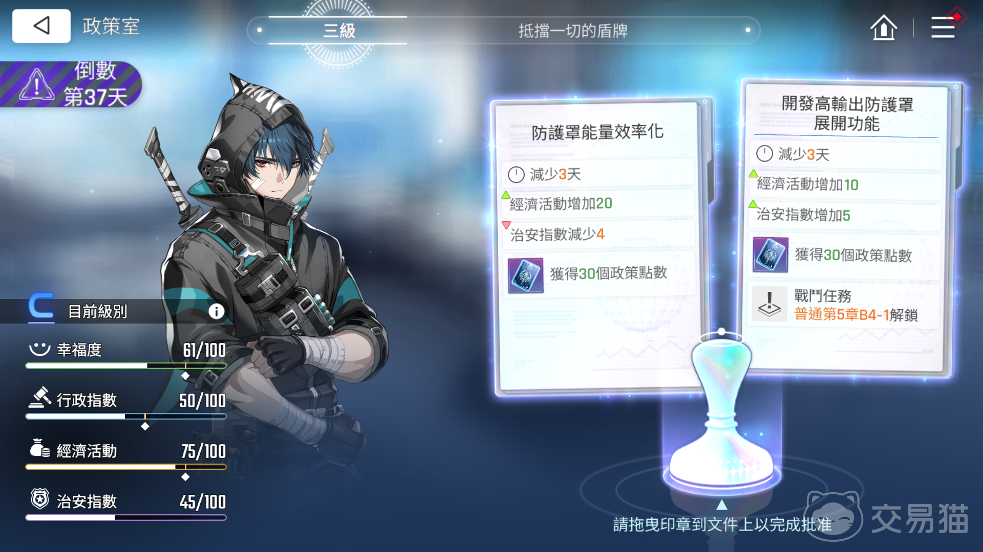 所有商品均以“政策点数”为唯一兑换货币,该代币仅能通过政策室任务稳定获取。政策室会周期性触发倒计时型灾难事件,玩家需在限定时间内完成对应政策目标。每次任务需同步保障行政指数、经济活动、治安指数三项核心指标达标,而提交政策报告书正是达成指标与获取点数的双重手段。当前任务奖励档位明确划分为20点与30点两类政策点数,结合任务难度与资源回报率进行梯度选择,是提升单位时间收益效率的核心方法。