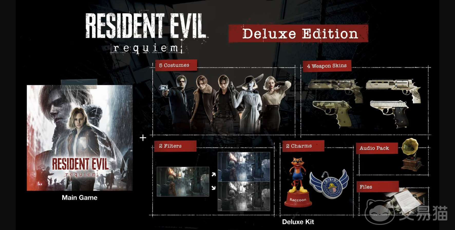 豪华包具体涵盖三类数字内容:其一为角色外观定制项,含男主角与女主角专属的“黑色电影”及“末日”主题服装共四套;其二为视觉增强组件,包括“末日滤镜”与“黑色电影滤镜”两款画面风格化效果,另附四款纯装饰性武器外观(无属性加成);其三为收藏向数字资产,含浣熊先生挂件、DSO徽章各一枚,专属音乐音效包一套,以及一份设定于1998年的剧情信件档案。标准版不包含上述任一附加内容,仅提供完整游戏本体。