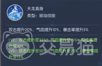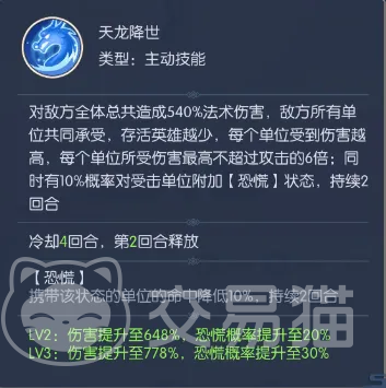 被动技能“天龙真身”提供常驻增益:攻击提升20%、气血提升10%、暴击率提升5%。主动大招“天龙降世”则对敌方全体存活单位合计造成540%法术伤害,伤害由当前存活英雄均摊——即敌方阵亡人数越多,剩余单位承受单体伤害越高。