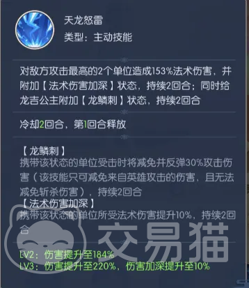 一技能“天雷怒雷”可锁定敌方攻击属性最高的两名单位,造成153%法术伤害,并施加持续2回合的“法术伤害加深”效果;同时为自身附加“龙鳞刺”状态,持续2回合。该状态使龙吉公主在受到英雄普通攻击时,减免并反弹30%所受伤害,但该减伤不作用于斩杀类伤害,且仅对英雄攻击生效。