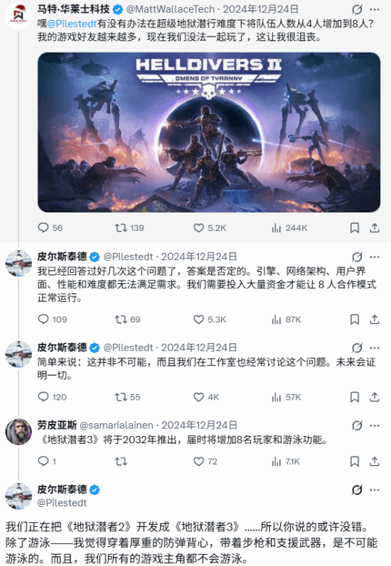 首席创意官兼创意总监 Johan Pilestedt曾在去年的粉丝互动中表示“我们正在把《绝地潜兵2》开发成《绝地潜兵3》……”