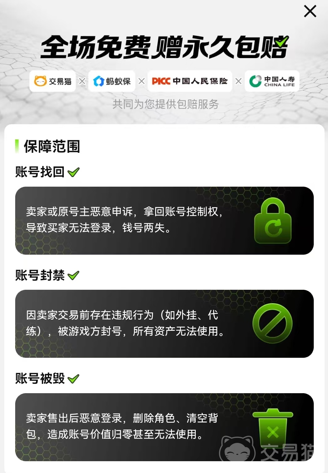 扫码下载APP 下载 点击下载APP之所以推荐大家选择,除了上面所说的服务优势之外,在安全方面的保障才是最重要的原因。无论是出售还是购买,整个交易过程都被所设计的独特安全保障措施所覆盖。通过上面链接可以下载安卓客户端,在安卓手机中直接就能够进行交易了。iOS系统用户需要搜索去官网操作。在安全方面,中所有进行交易的成品号都做到了永久包赔全覆盖,包赔比例有两种,分别是30%和全额。在挑选游戏号时候可以直接进行选择,尽量找全额包赔商品购买。