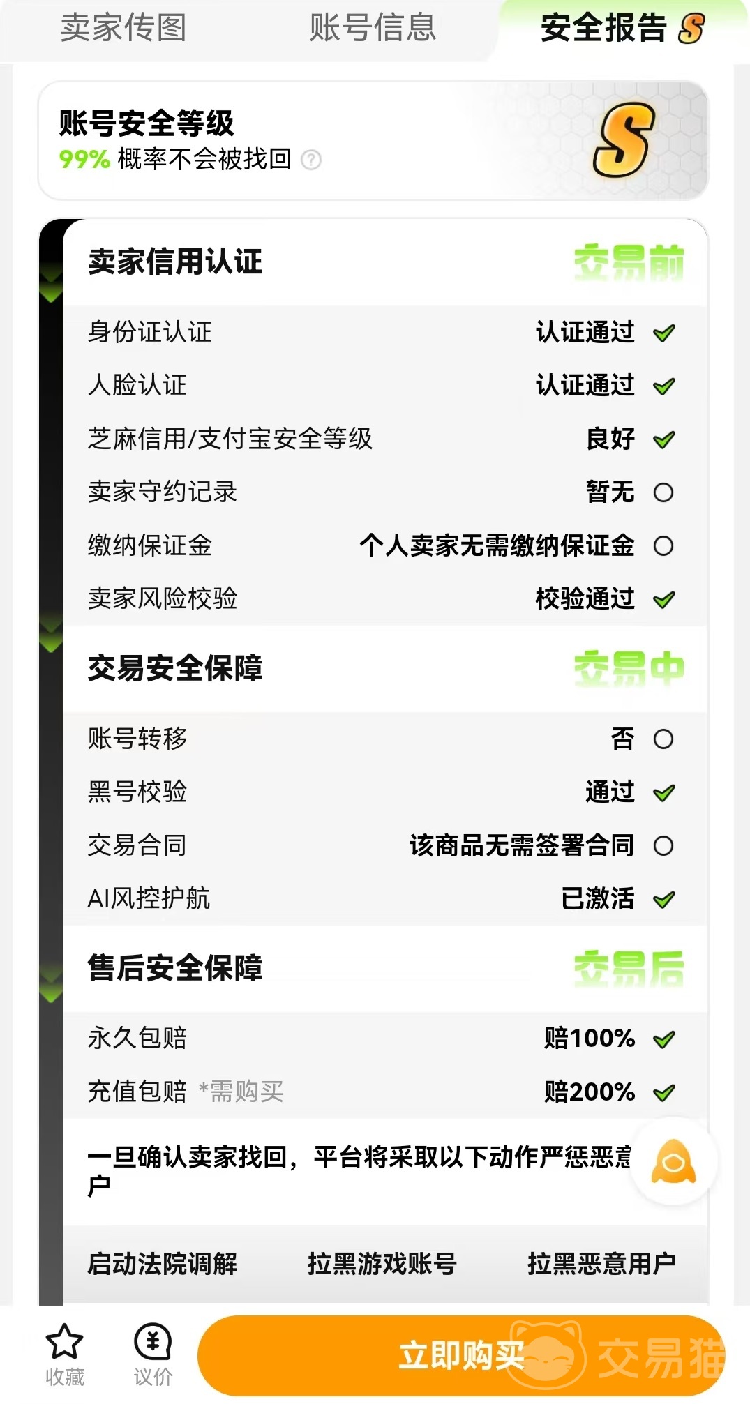 中上架的号还会有一份详细的安全报告,这份报告是结合卖家信用认证,交易安全保障和售后安全保障等多个方面来进行综合评价。达到S或者是SS,是最佳选择商品。如果安全等级过低是不允许出售的,这样就给所有用户都带来了一份真正的安全保障。也净化了交易环境,让诚实守信的卖家能够卖出好的价格。交易最后的发货环节采用的也是平台发货的模式,专业交易人员直接进行操作,双方只需要进行简单配合,这样整个过程既安全又高效。买家可以放心的拿到自己喜欢的号进入游戏中体验,卖家也能尽快拿到收益。
