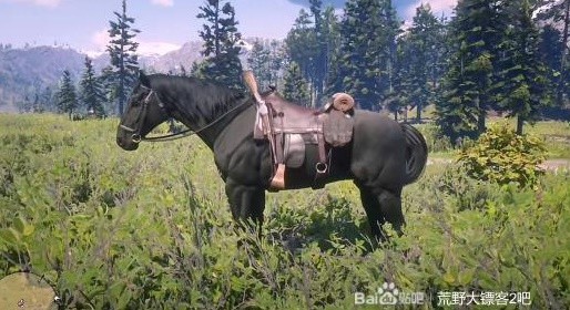 第3匹就是黑色的美国标准种马,由于此马常常似隐藏在一大群马之中,所以很多玩家就很难发现它,以为它就是一匹极为普通的田纳西走马。野外捕获的具体位置在草莓镇的正上方,小溪河的一片小树林旁。各位骑马过来后,最好是先站在远处用望远镜找一找,毕竟在它身边还有好几匹别的马儿,瞄准了具体位置,再骑马赶过去,由此此马爱往小树林中钻,所以还是用绳索套会好一点,套住后下马慢慢接近,然后又是上马驯服那一套,用不了20秒,这匹帅气的黑色版本的美国标准种马厩属于你了。