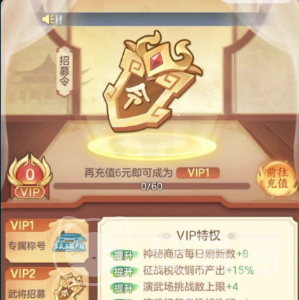 首充双倍返利活动为另一关键入口,最低档位仅需6元,即可按1:2比例返还元宝——即6元得120元宝,68元得1360元宝。该充值不仅直接扩充元宝储备,还可激活限定招募卡池,大幅提升获取赵云等核心武将的概率。同时,6元充值自动解锁VIP1等级,并授予“夜三国户籍”专属称号。随着VIP等级提升,玩家可逐步开放高级武将定向招募权限、专属头像框,以及神秘商店每日额外8次刷新机会,持续强化资源获取效率。