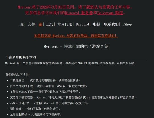 Myrient,一个拥有390TB的大规模复古游戏网站宣布将在三月底停止运营。长期以来,这个网站一直是数字存档与互联网无私精神的典范:它无广告运营,不限制下载次数,完全依靠用户捐赠生存。现在,项目创始人Alexey不得不宣布关闭。