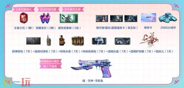 核心道具奖励:魂·天神-宇航兔、王者之石*1、觉醒宝石*2、堕天使/复仇/雷霆道具卡(各五张)、属性变更券*2、保存卡;