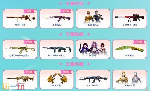 核心道具奖励:幻神-丹凤、王者雷影、王者潘多拉、Barrett-极光、QBZ-03-王者蔷薇、M14EBR-玄武、关小雨、王者玉锋、凰鸣之魄、王者岩刺、AK12-天启、王者-魅影等。