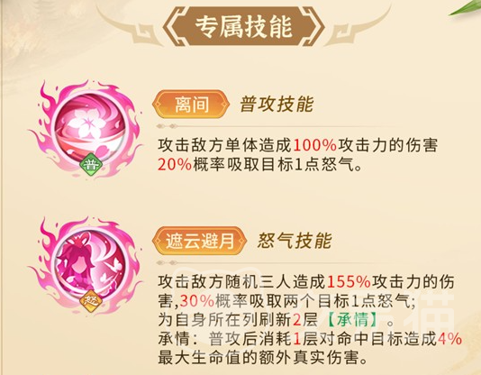 技能体系高度聚焦两大维度:控怒与叠伤。普攻“离间”对单体目标造成100%攻击力伤害,并有20%几率吸取1点怒气,专克依赖怒气释放高伤大招的敌方主力;怒气技“遮云避月”为群体打击技能,随机选定敌方三人,造成155%攻击力伤害,同时拥有30%概率对其中两名目标各吸取1点怒气。该效果具备反制特性——目标当前生命比例越高,反噬强度越显著;且同列友军可共享此反噬增益,强化团队协同压制能力。
