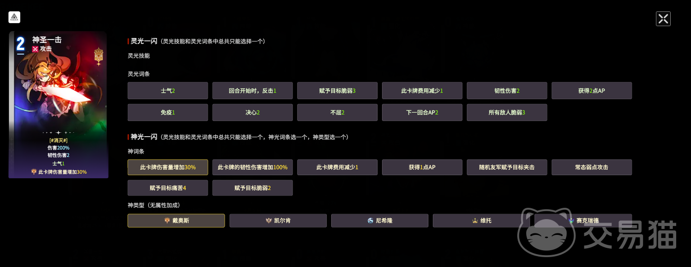 第二张关键卡牌是【神圣一击】。在满足“消灭”状态前提下,该卡可达成200%倍率的高额伤害,并同步施加可观流血效果。最优词条组合为“卡牌的韧性增加100%”、“此卡费用减少1”、“赋予目标痛苦4”。三项词条分别优化生存容错、降低启动门槛、增强状态压制,共同支撑其在中后期稳定打出高伤流血链。