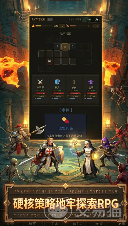 游戏核心玩法围绕英雄编队与地牢闯关展开。玩家需招募十字军、老兵、修女等多类型角色,依据职业特性、技能组合与属性克制关系,灵活构建四人小队。进入地牢后,将遭遇骷髅、弓手、僵尸等不同配置的敌人,需实时走位、预判攻击范围,并应对隐藏机关与伏击点,强调策略性操作与临场反应。