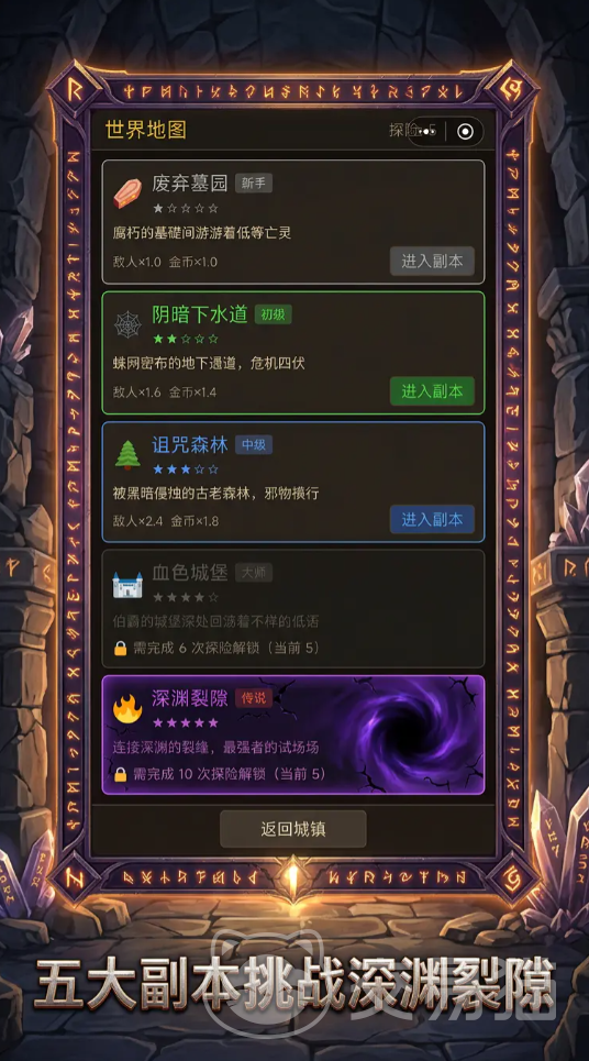 地图系统采用星级难度分级制,共设一至五星副本。新手推荐从一星、二星地图起步,逐步熟悉机制与数值成长曲线;待角色练度提升、队伍成型后,再挑战高星区域。需注意:高星副本存在前置通关条件,如完成指定主线章节、达成特定英雄星级或城镇建筑等级,满足后方可解锁入口。
