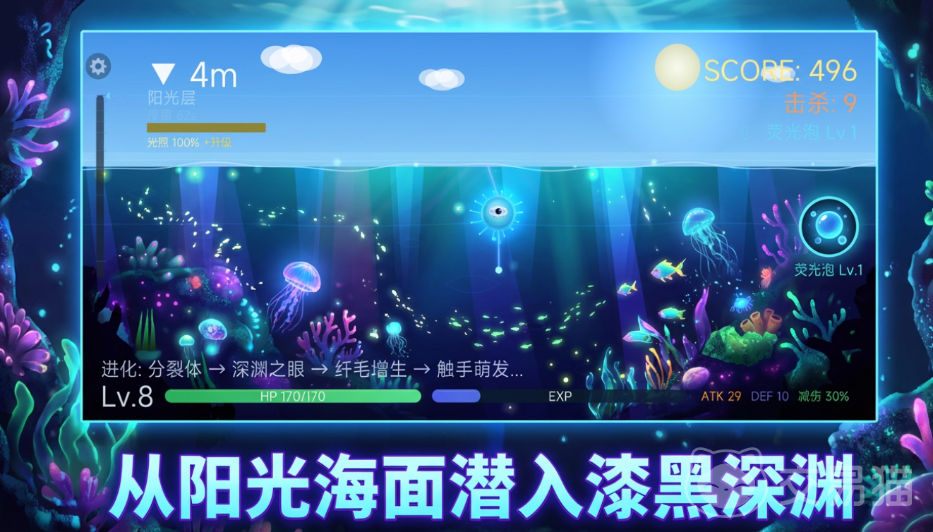 《荧光深渊》是一款聚焦深海生态与自主进化的策略型动作RPG。游戏以真实海洋生物学为灵感,构建出层次丰富的海底演化树系统。玩家从单细胞发光体起步,通过战斗积累能量,触发关键进化节点——每次升级提供四项不可逆路径:触手强化(高爆发近战控制)、甲壳增生(极限防御与抗性堆叠)、毒素腺体(持续伤害与群体削弱)、荧光脉冲(全屏范围激光打击)。路线选择直接影响后续敌群配置、关卡难度曲线及终局形态上限。