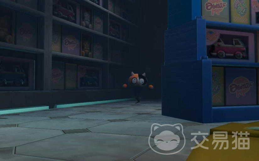 玩具区整体照明极为微弱,多数区域仅靠局部光源维持可视度,货架轮廓模糊,陈设物品细节难以辨识。入口处矗立一只巨型积木造型蛋仔,面部虽呈标准微笑形态,但在低照度环境与阴影投射下呈现出明显违和感。悬挂于半空的广告牌表面斑驳褪色,边缘卷曲,强化了场所年久失修的观感。货架上整齐陈列着大量封装完好的玩具模型,本应唤起童年记忆的视觉元素,在昏暗色调与静默音效衬托下反而引发心理层面的微妙不适。