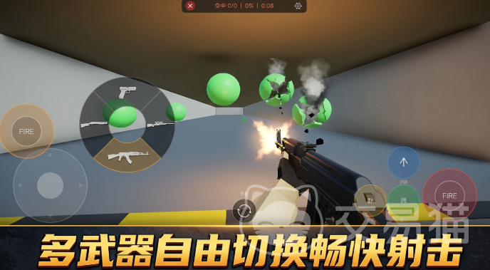 动态目标系统构成高强度实战压力:随机部署的气球靶、高速环形移动靶、混杂于掩体柱与可摧毁木箱之间的武装歹徒及人质目标,共同构建出节奏紧凑、信息复杂的微型对抗空间。玩家需在毫秒级时间内完成威胁识别、优先级判断、精准瞄准与安全击发全流程。操作层面支持站立、蹲伏、卧倒三态自由切换,并融合冲刺、跳跃等战术位移动作;枪械配备物理级后坐力模型与多倍率光学瞄具,所有弹道轨迹均由玩家压枪精度实时决定。
