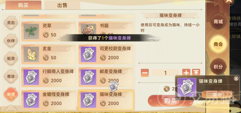 变身牌并不直接展示在商会首页,需按路径逐步进入:先从主界面点击【商会】,再切换至右侧商会面板;随后在左侧分类栏中选择【杂货】,下滑至页面底部即可发现该道具。当前共提供五种身份类型——司更校尉、行脚商人、邮差、金蟾怪与猫咪,每种均对应独立外观及行为表现。