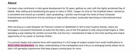 Ben Jones在ZeniMax Online Studio担任“黑鸟”项目游戏总监,其领英简介中写道:“我是一名经验丰富的领导者与创意核心,参与过的项目涵盖从小型模组到4亿美元级大作的全范围。”