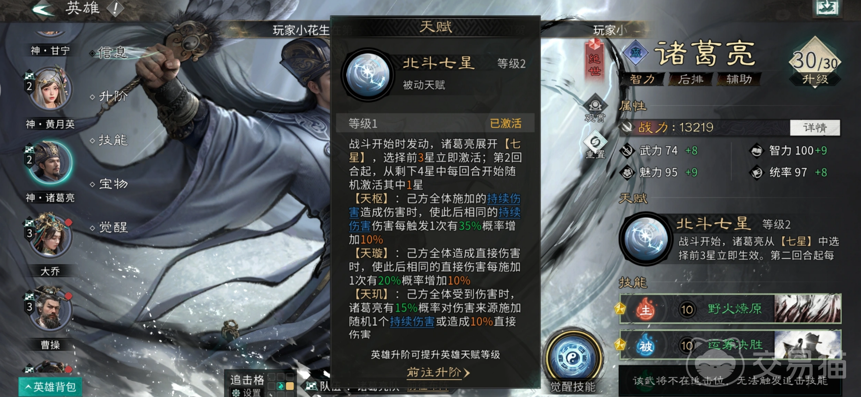 摇光天赋进一步强化其功能上限:可降低敌方技能及天赋的触发概率,有效克制依赖高频特效的阵容。随着角色等级与阶级提升,“北斗七星”整体效能同步增强,且支持根据队伍配置灵活调整星辰激活倾向——例如主力输出为物理系时,可侧重强化天枢、天璇等增伤星轨,从而实现全队输出效率跃升。无论单兵作战还是团队协作,诸葛亮均能承担枢纽角色,成为衔接攻防转换的关键节点。