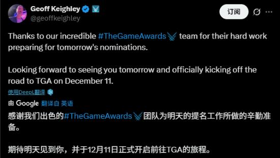 TGA主持人Geoff Keighley今日发布动态,感谢团队为提名工作所做的辛勤准备。提名名单将于明日公布,TGA将于12月12日上午9点正式开始颁奖(北京时间),根据往届经验,会从8点半开始播片。