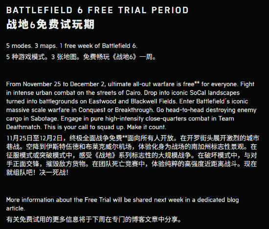 昨日《战地6》更新了赛季活动“加州抵抗军”,更新了新地图和新武器并修复了一些问题,并且《战地6》将于11月25日至12月2日期间,展开为期一周的免费试玩活动。