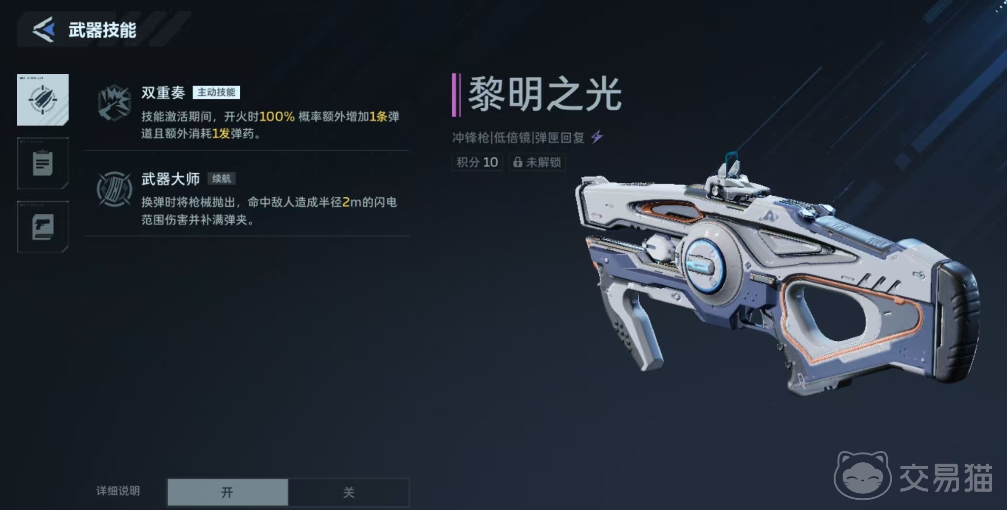 该武器配备两项核心技能:主动型技能“双重奏”可在开启期间实现100%概率附加第二条独立弹道,每次开火额外消耗1发弹药,大幅提升单位时间内的命中覆盖面积;被动型技能“武器大师”则聚焦续航——换弹时自动投掷枪械,命中目标后触发半径2米的闪电范围伤害,并同步补满当前弹匣。这一组合使黎明之光在近战压制与节奏衔接上具备天然优势,配合队友协同推进时,能有效压缩敌方反应窗口。